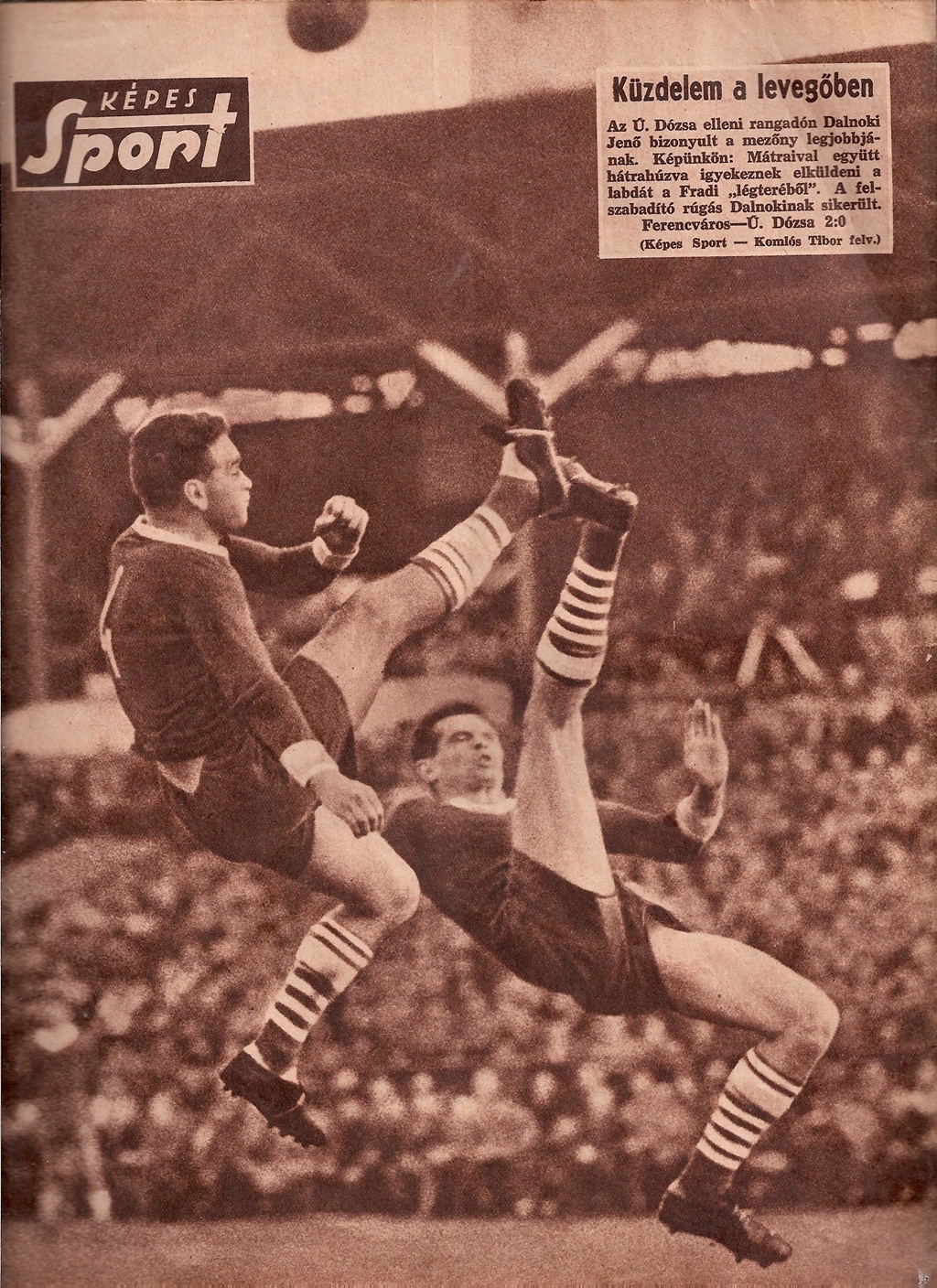 A tétnek megfelelően remek volt az iram és igen jó a játék, amelynek során a Fradi két perc alatt két gólt szerzett. Ettől a zöldek valósággal szárnyakat kaptak. Olykor repültek is. Szó szerint értendő ez az alábbi képen, ahol Dalnoki Jenő és Mátrai Sándor védekezik. A labdát végül Dalnoki Jenő rúgta el. A képen is átsüt az az ellenállhatatlan küzdeniakarás és szív, amely ezeket a játékosokat jellemezte. Látunk ma ilyen jelenetet?